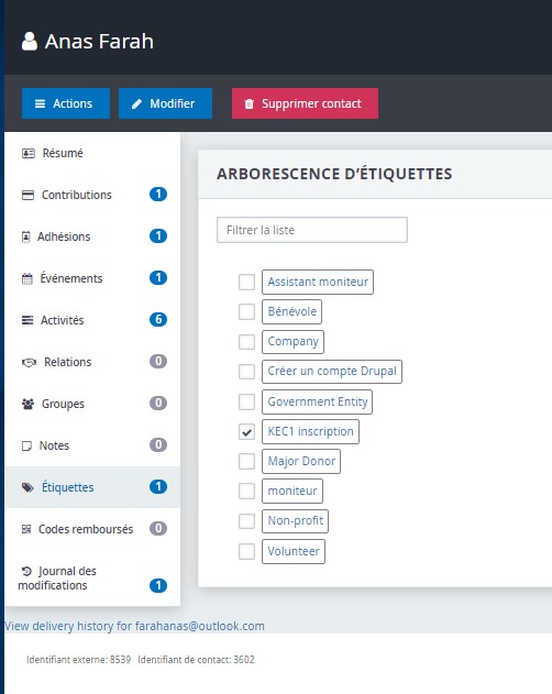 - Ouvrir la liste des participants à la formation: Consulter le contact, si aucun No Externe et adhésion=0 -> onglet Etiquette et sélectionner KEC1 Inscription, F5 pour actualiser