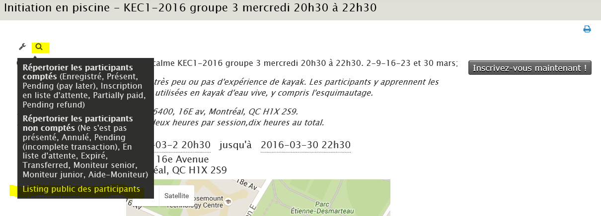 b) Ouvrir l’événement, et cliquer sur la loupe en haut à gauche/ listing public des participants, Cette liste inclus les assignations de kayak en fonction du poids du participant.