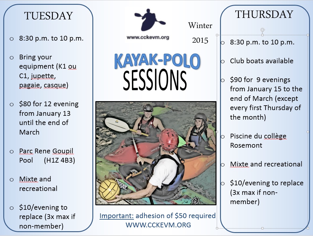 Venez pratiquer vos esquimautages, appuis, réflexes tout en ayant du fun. Le kayak polo est un sport d'équipe récréatif qui permet au pagayeur débutant à expert de garder la forme pendant l'hiver. On joue les mardis avec notre équipement (kayak, pagaie, casque, jupette) dans une piscine intérieure de Montréal. C'est une belle opportunité pour vous permettre de continuer de jouer dans l'eau!